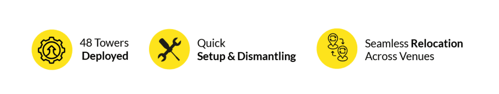 Each tower could be installed in 10–15 minutes, dismantled in under 10 minutes, and relocated within 12–18 minutes, allowing quick reconfiguration between events without interrupting schedules.